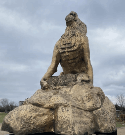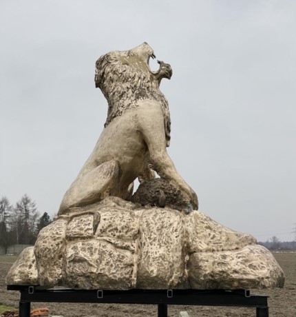For the past year or so, Rick (the sculptor) has been working on another piece, called the Vengeance on the Lamb. It’s a lion and it’s huge! And there’s a lamb lying between the paws of lion, the lamb that was slain before the foundation of the world. On Friday 27th January Rick and a group of friends brought it to its final resting place at the front of his property. Now, when we look out of our kitchen window, we see a HUGE lion roaring over Birkenau.
