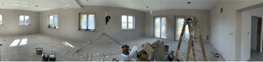 A panoramic shot of the lounge in the process of being painted
